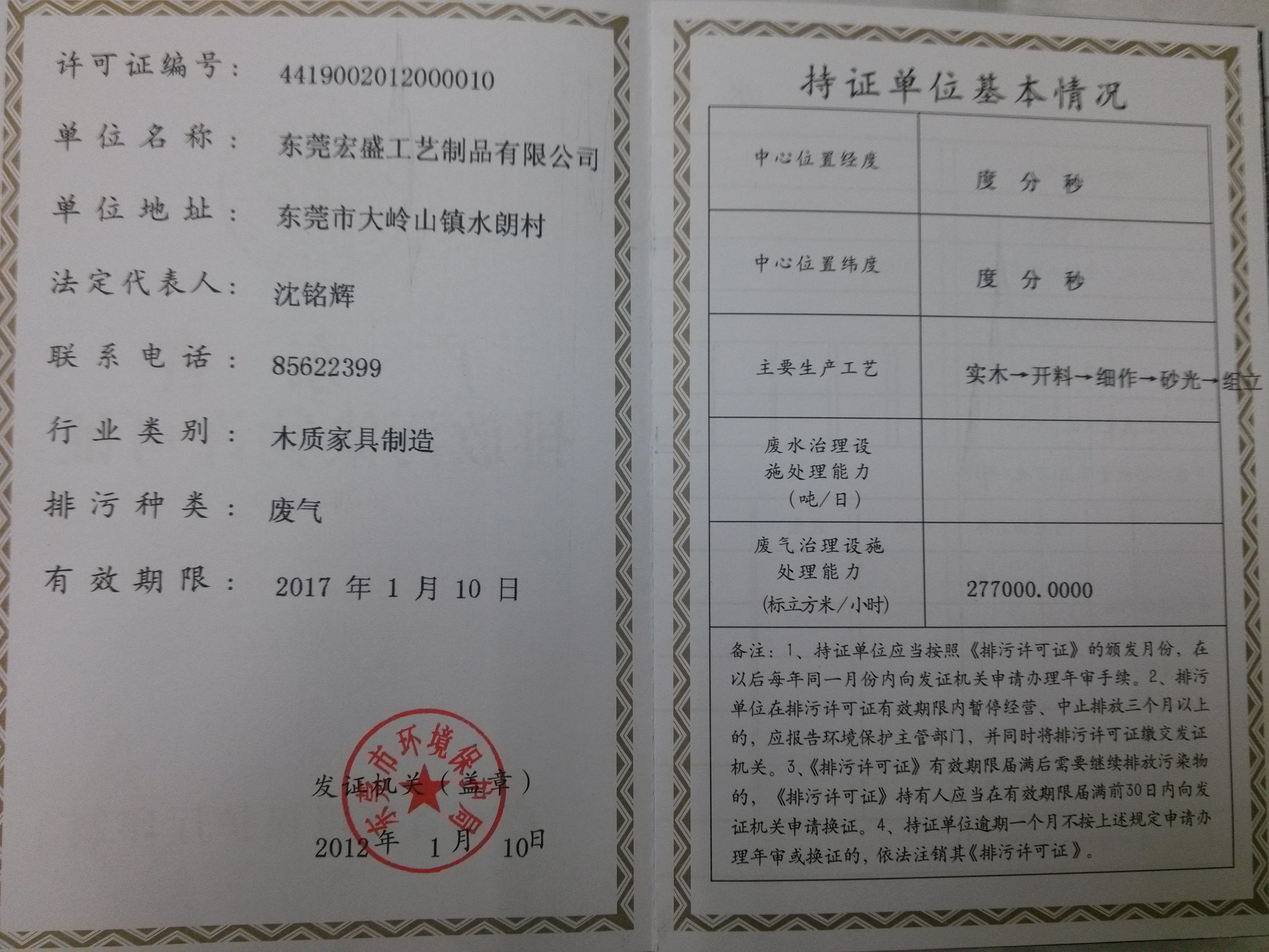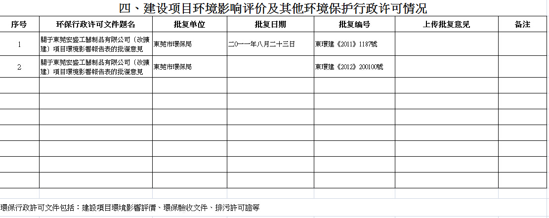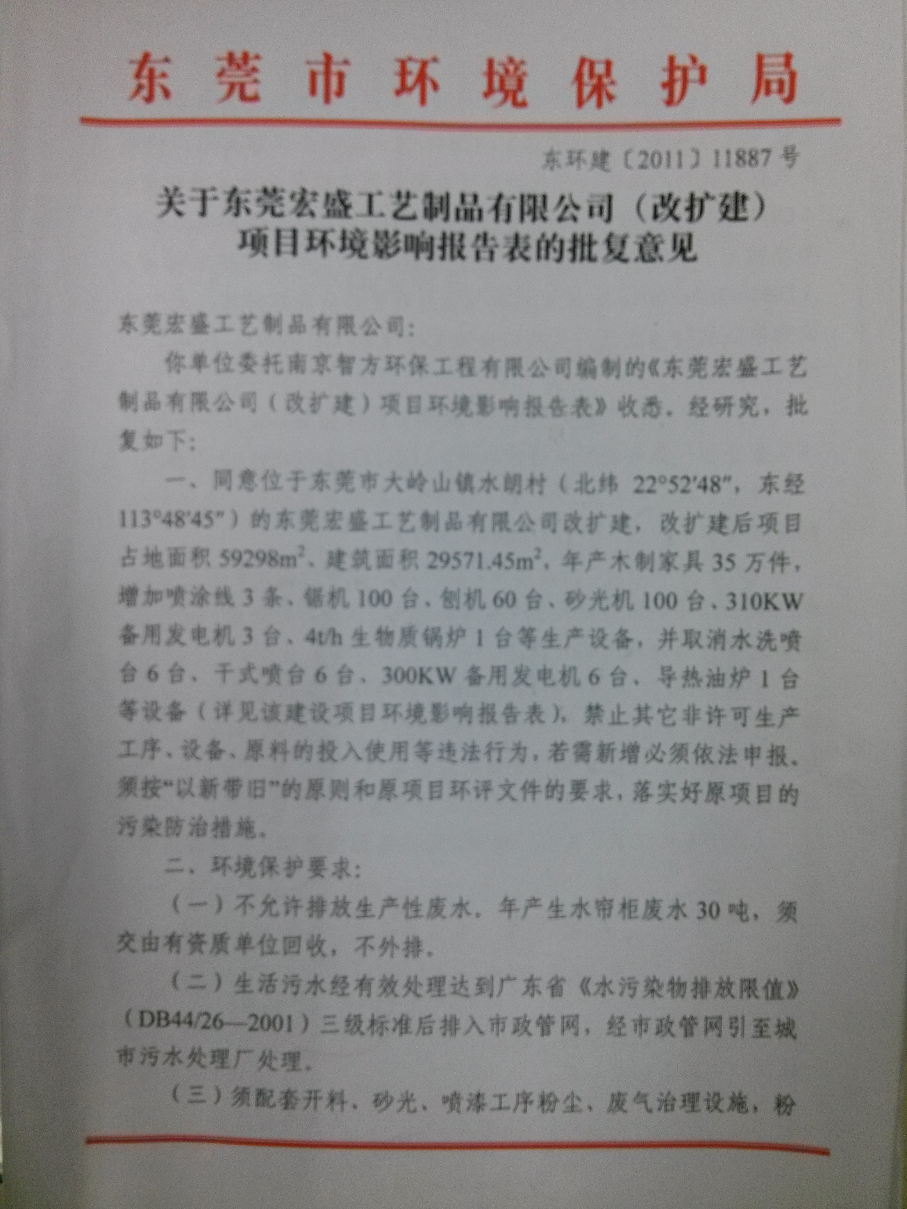 关于东莞宏盛工艺制品有限公司(改扩建)项目环境影响报告表的批复意见》东环建(2011)1187号 |