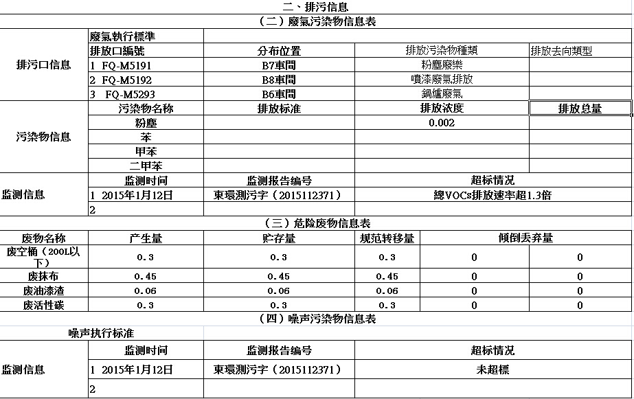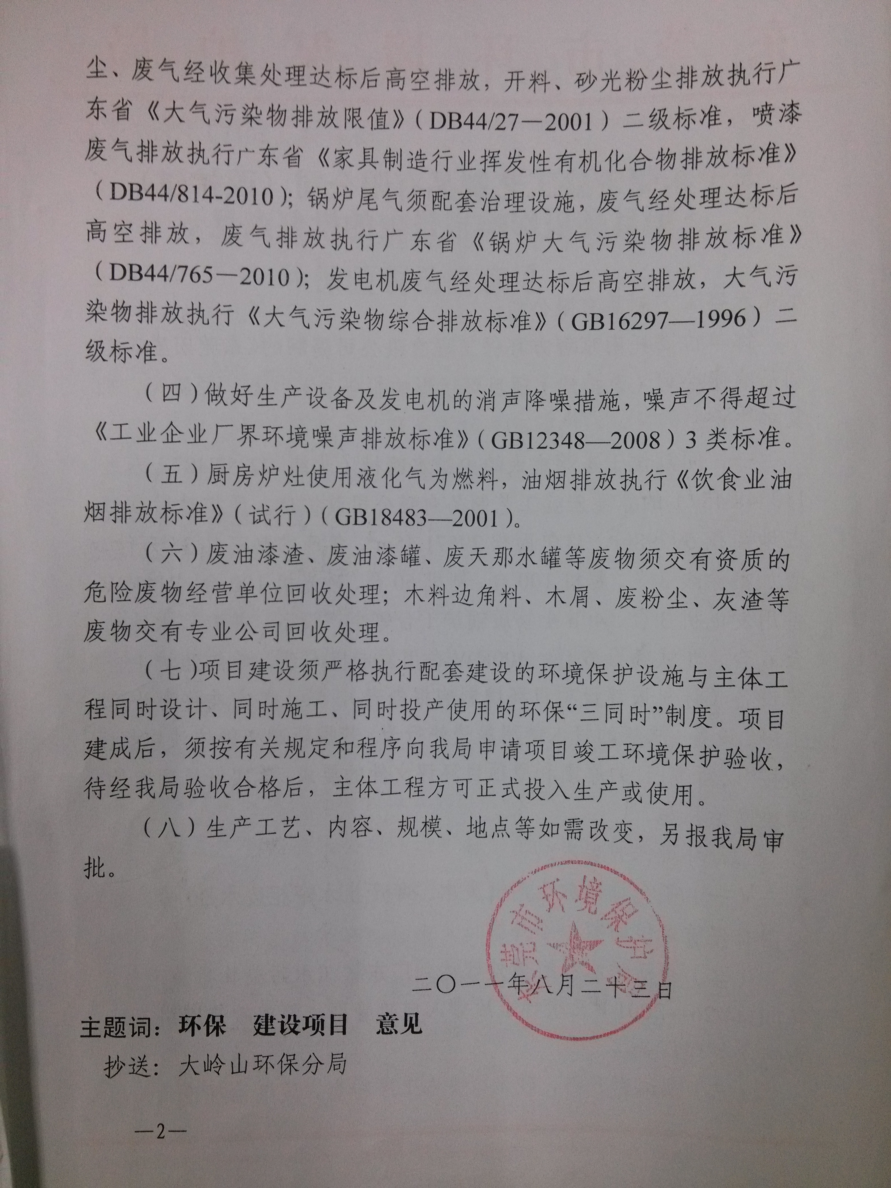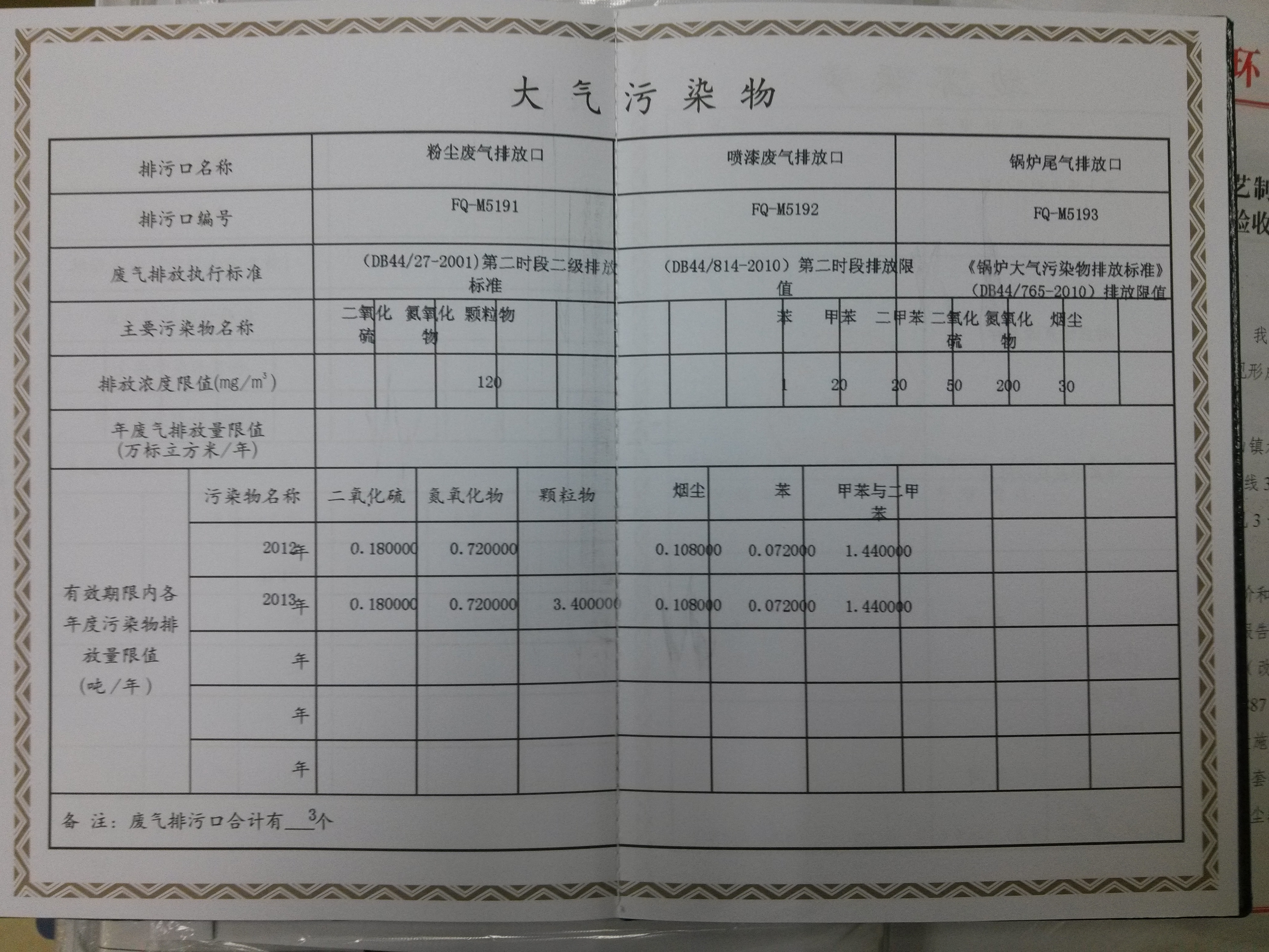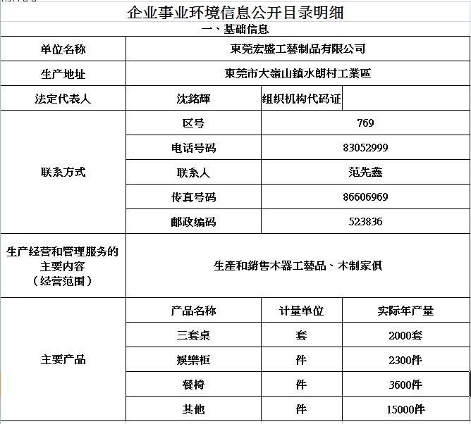 | 我司于2000年10月投资东莞大岭山镇水朗村,设立东莞宏盛工艺制品有限公司,法定代表人沈铭辉,现在职工200人,主要从事木制家具的加工生产,年产木制家具15万件,主要污染设备的喷涂线3条(共含干式喷柜16台、水帘柜22台、)、310KW备用发电机3台及4t/h生物质锅炉1台。 |