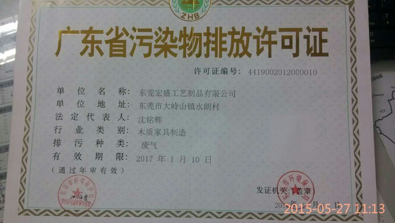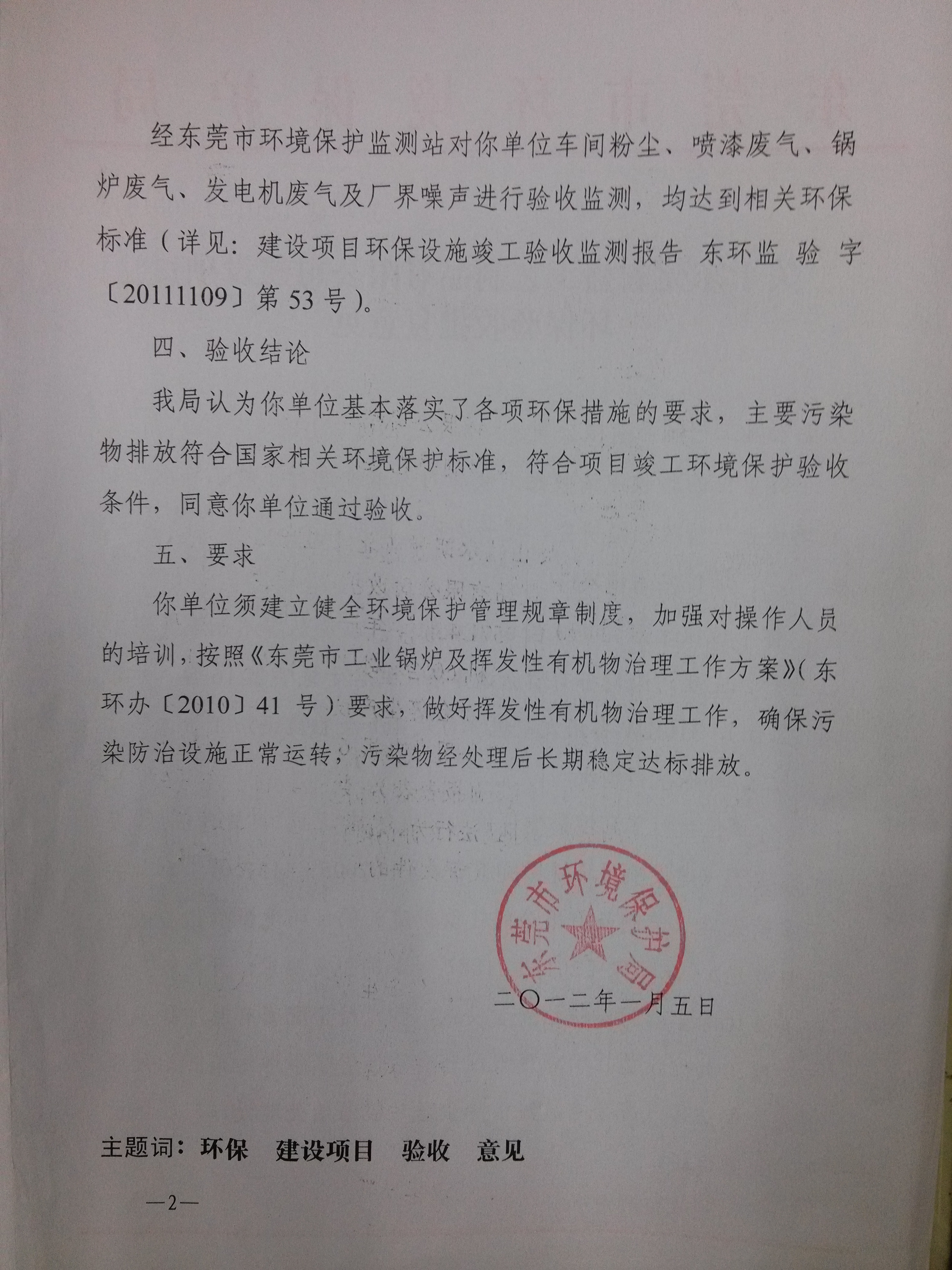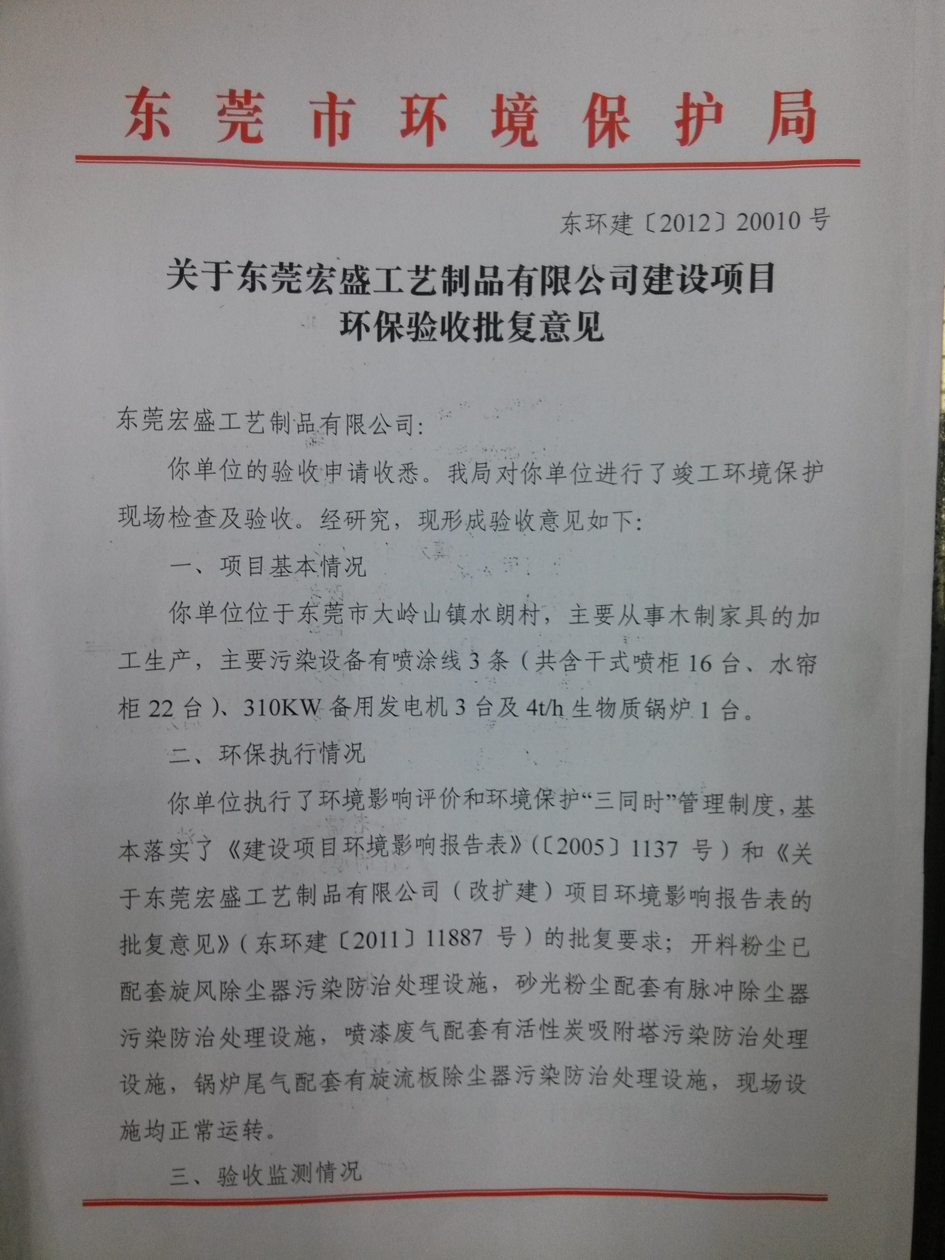 关于东莞宏盛工艺制品有限公司建设项目环保验收批复意见》东环建(2012)20010号 |