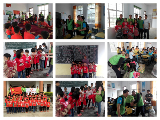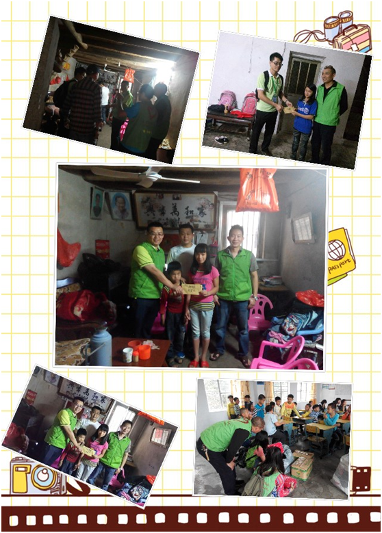 2014年月18-19日两天,环总志愿服务与欧旻志愿服务队一行九人,从大岭山出发,经过三个半小时来到了揭阳市揭西县龙潭镇龙田小学开展爱心助学活动,为龙国小学的小学生们带去了200多件童装、两箱儿童书籍、欧旻支部捐赠的书包及两台台式电脑并亲手送到老师及同学们的手中,同时在现场我们所有志愿报务队的人员再时进行募捐活动,筹得善款2800多元,对困难家庭进行走访并送上慰问金。分别走访了: